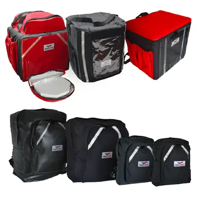 MOCHILAS DE DIVERSOS TAMANHOS E MATERIAIS; MOCHILAS PARA ENTREGA DE PIZZAS E MARMITEX; BOLSA TÉRMICA PARA PIZZAS