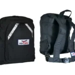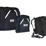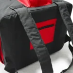 Mochila Lanche: Lona preta ou Nylon preta e vermelha.